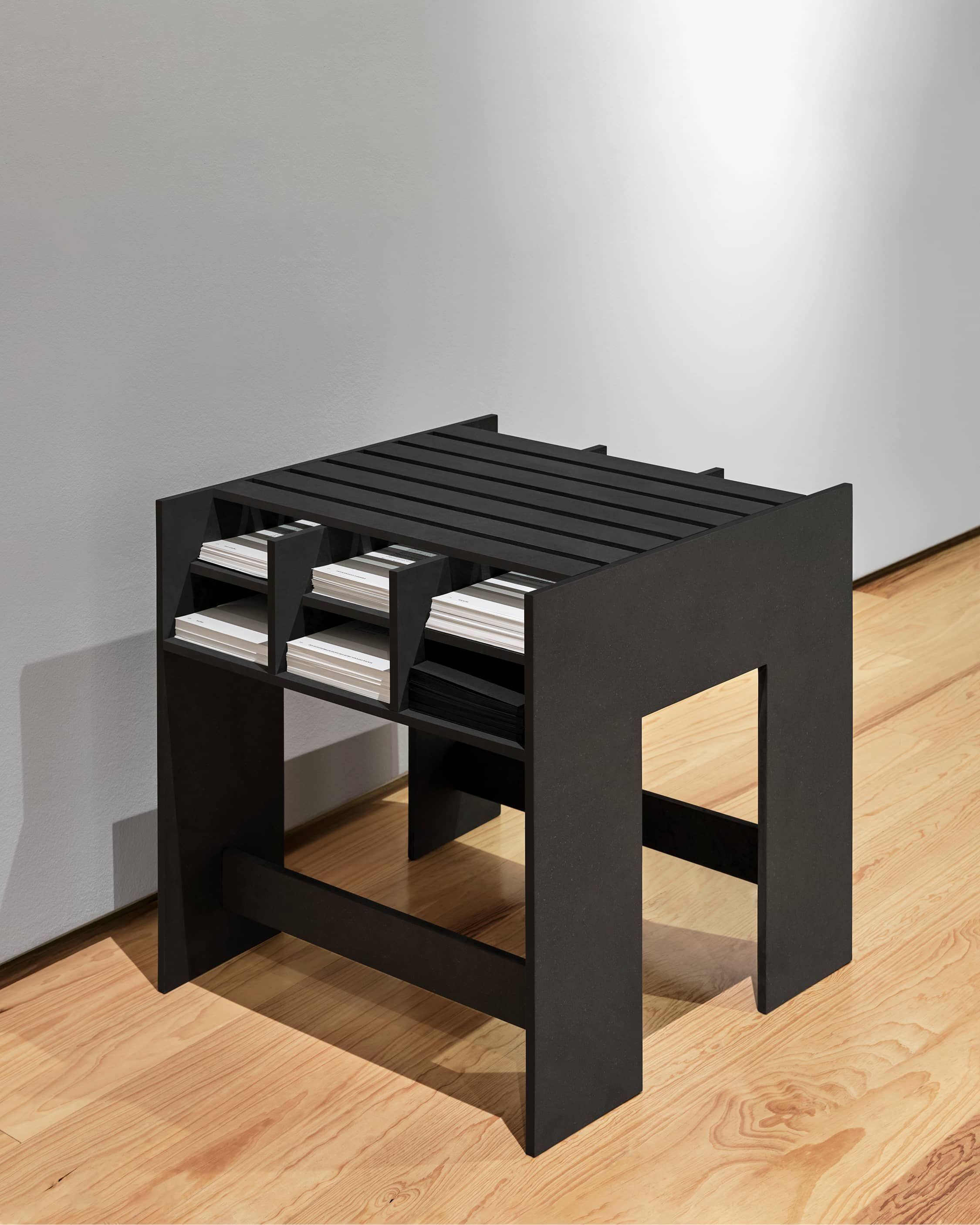 The furniture was commissioned to hold eight different pamphlets containing background information on each series. The Wall vinyl and pamphlets were typeset in Redaction. The font was commissioned by Titus Kaphar and Reginald Dwayne Betts and is drawn from the typefaces used in legal documents from claims filed by the US Civil Rights Corps.