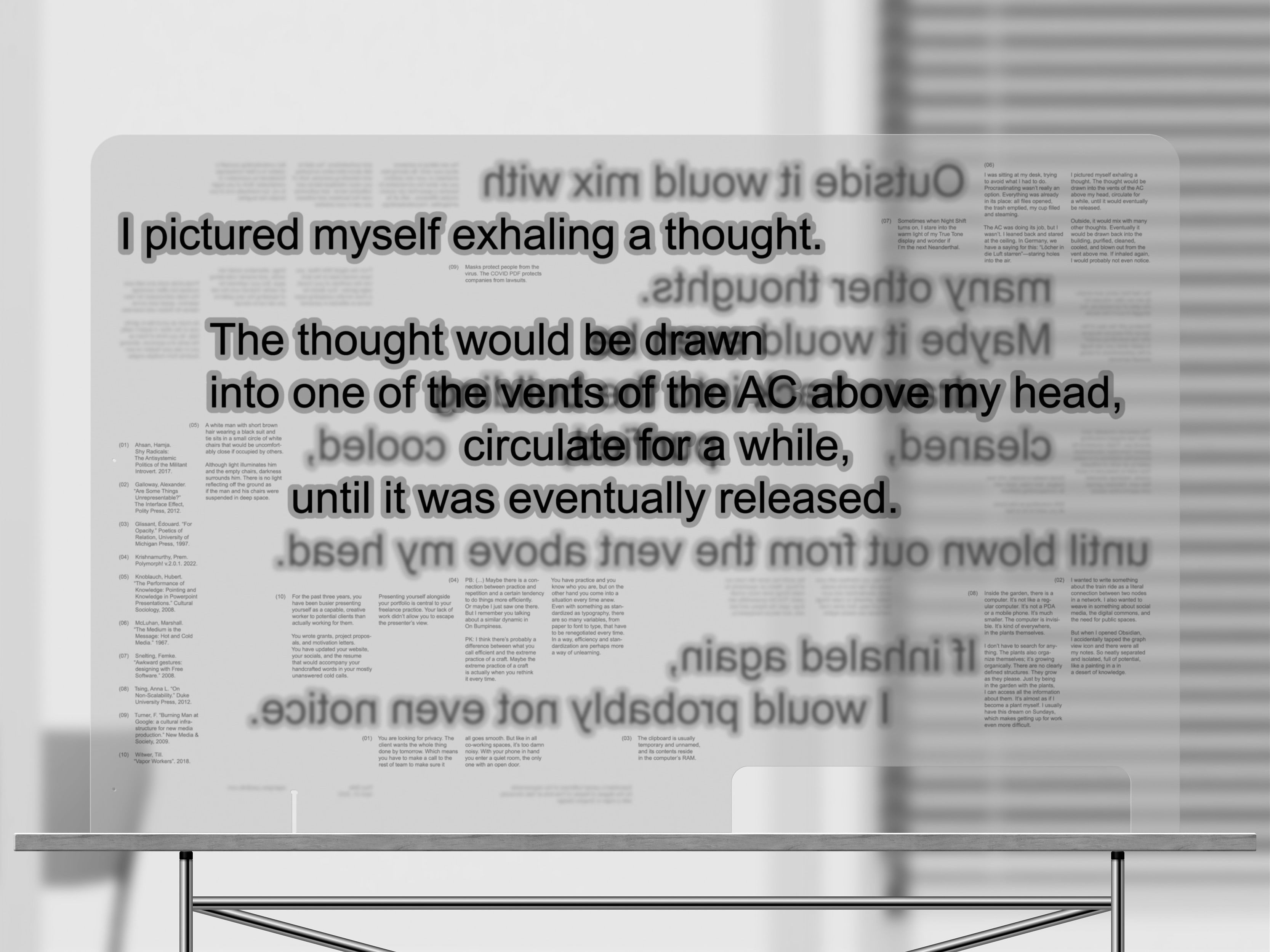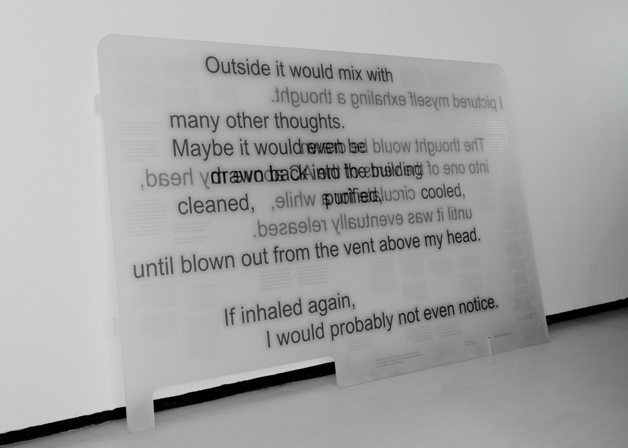 Two 42’ by 32’ sanded and UV-printed acrylic sheets that hold various pieces of my own writing.