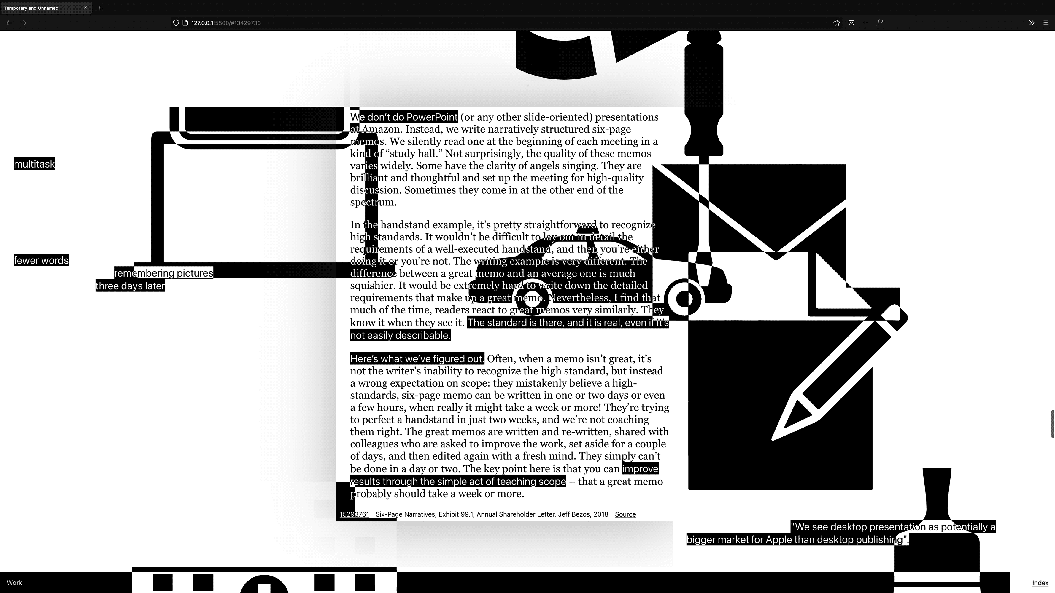Nothing less but the entire interwingled history of (presentation) software, personal computing it's (psychedelic) corporate<>counter-culture filtered through the sixteen categories of the Apple Shape Library using the Are.na API.