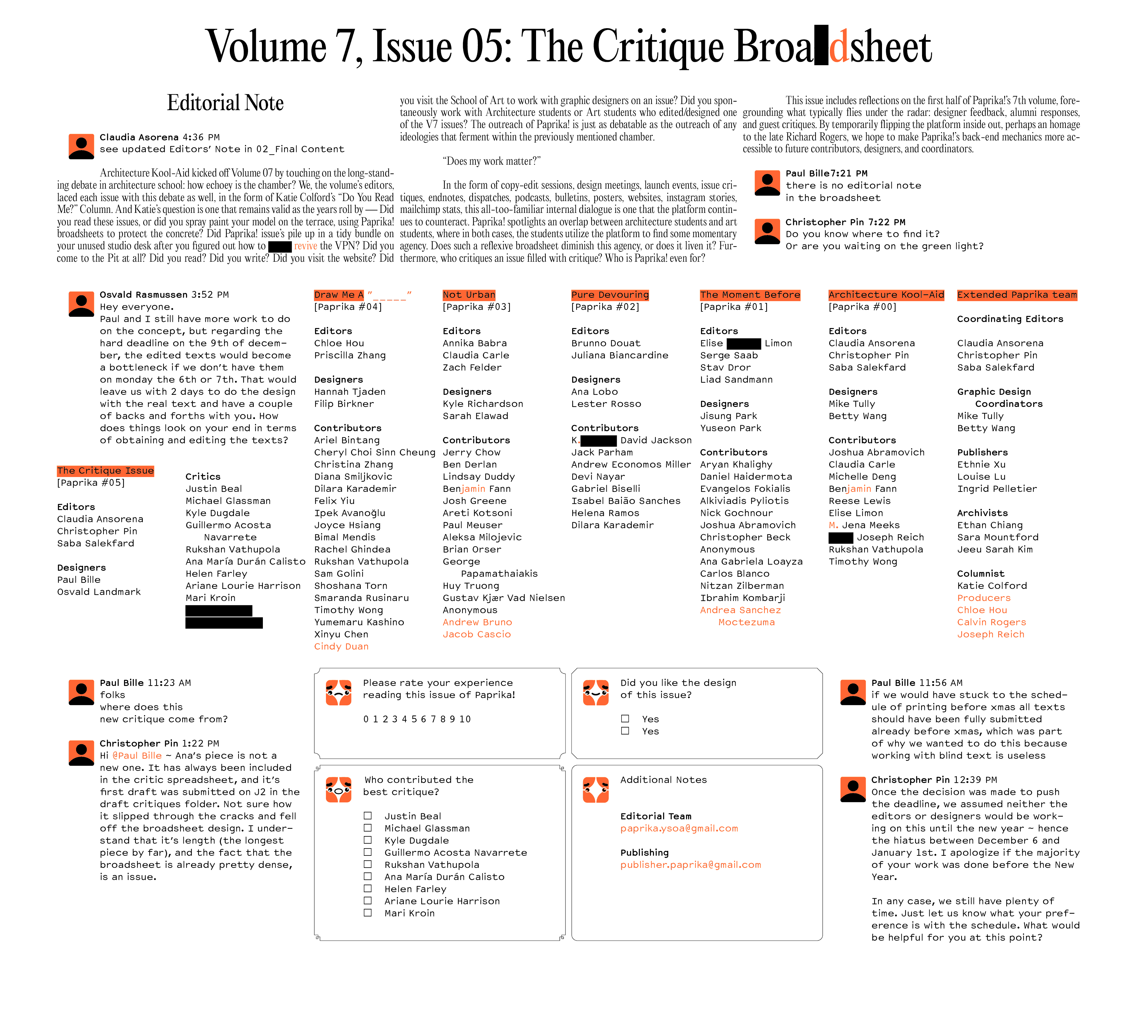 Paprika! is the often-weekly broadsheet published by the students of the Yale School of Architecture and Yale School of Art. The theme of the 7th volume of the broadhseet was Critique. Each article in this volume responds to a previous issue. We interlaced each response with content from the respective Slack channels that have been used during the production of each issue.