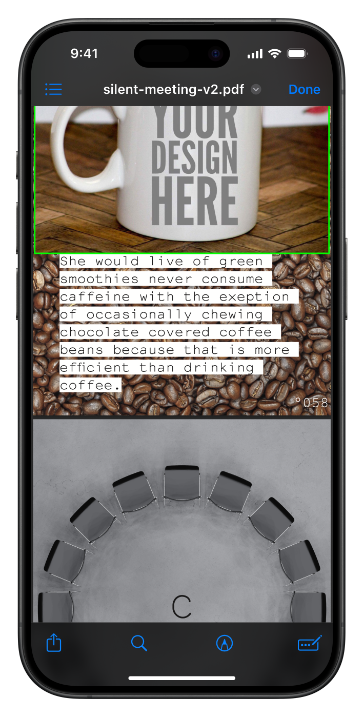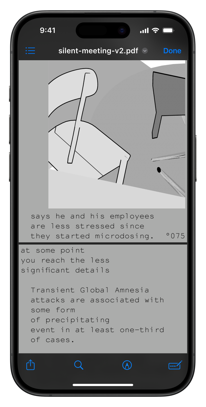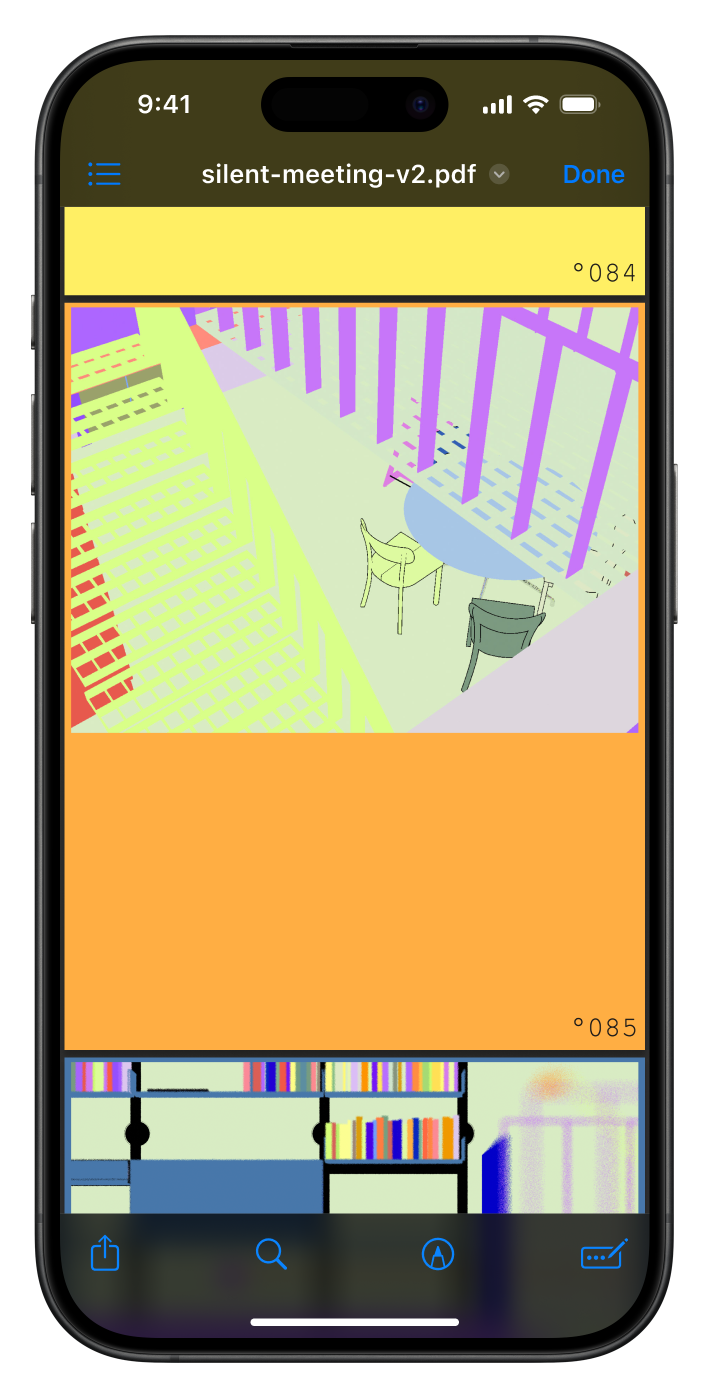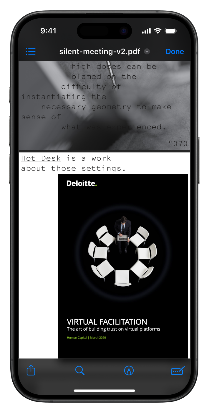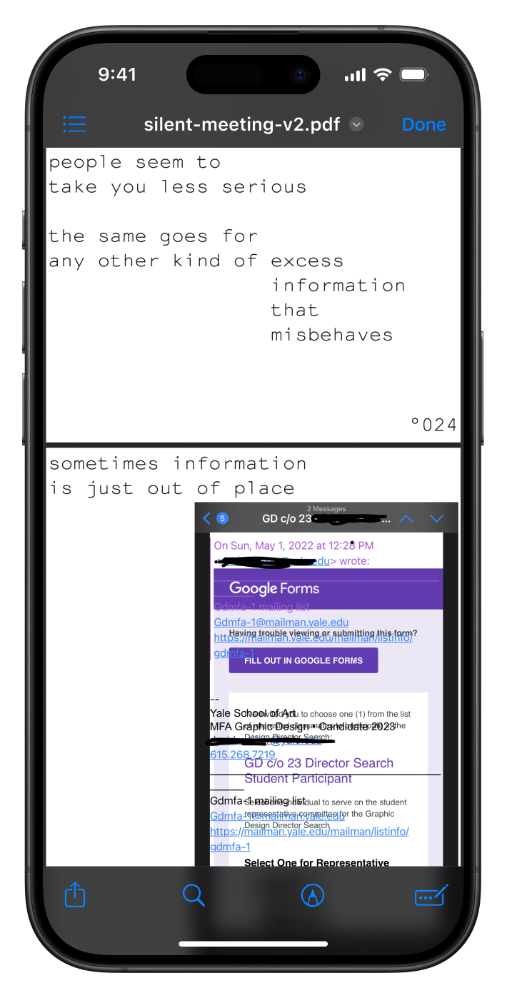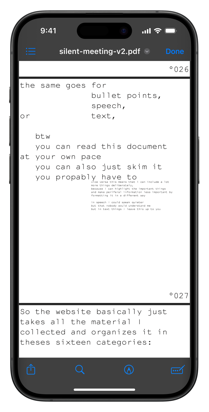 For the second silent meeting participants were was urged to skim a 100 page pdf while a ketlle reaches a 100 degrees. I also used the PDF as a chance to show some of thematic overlap in-between Temporary and Unnamed and Hot Desk. Download the PDF here.