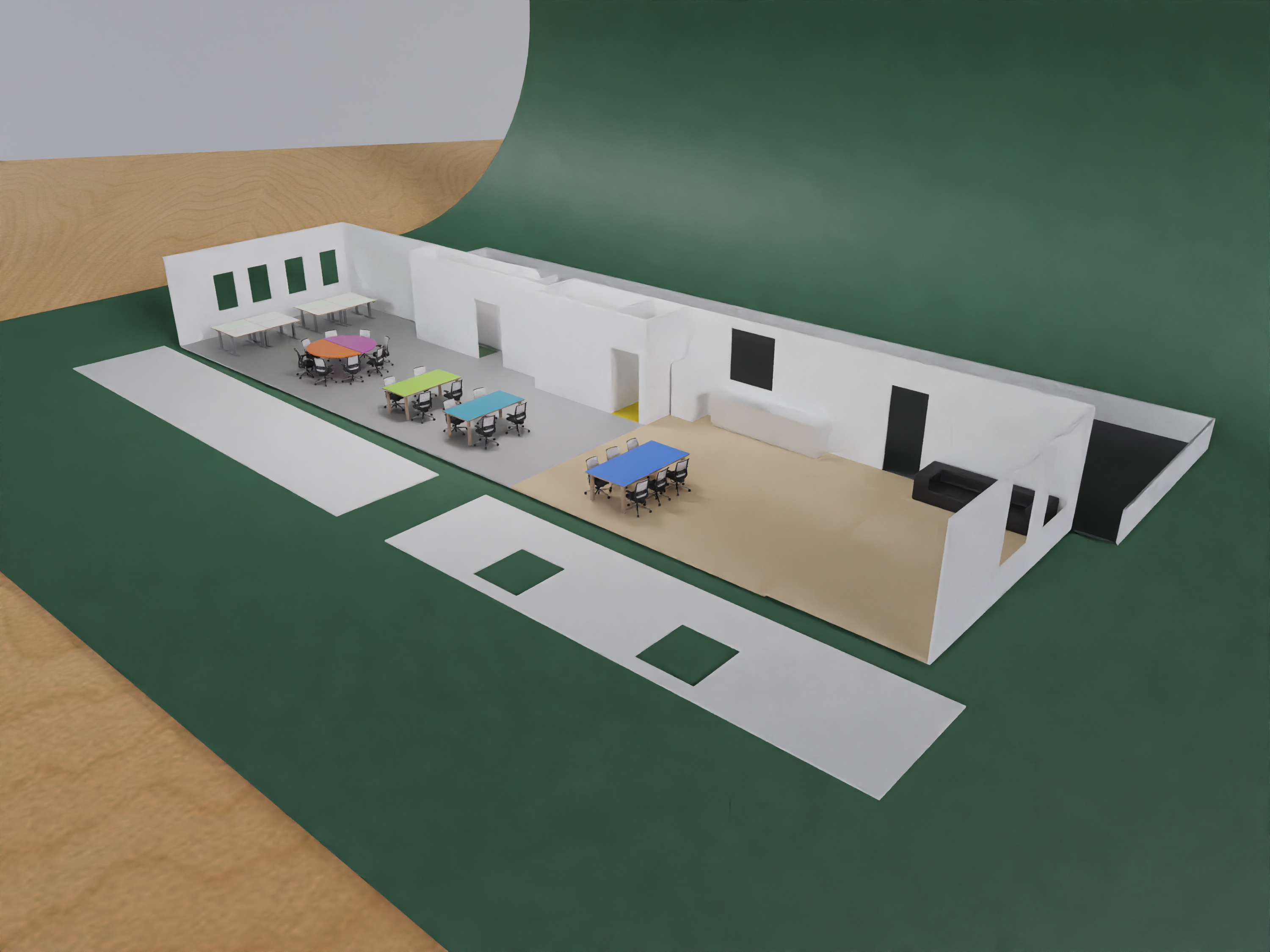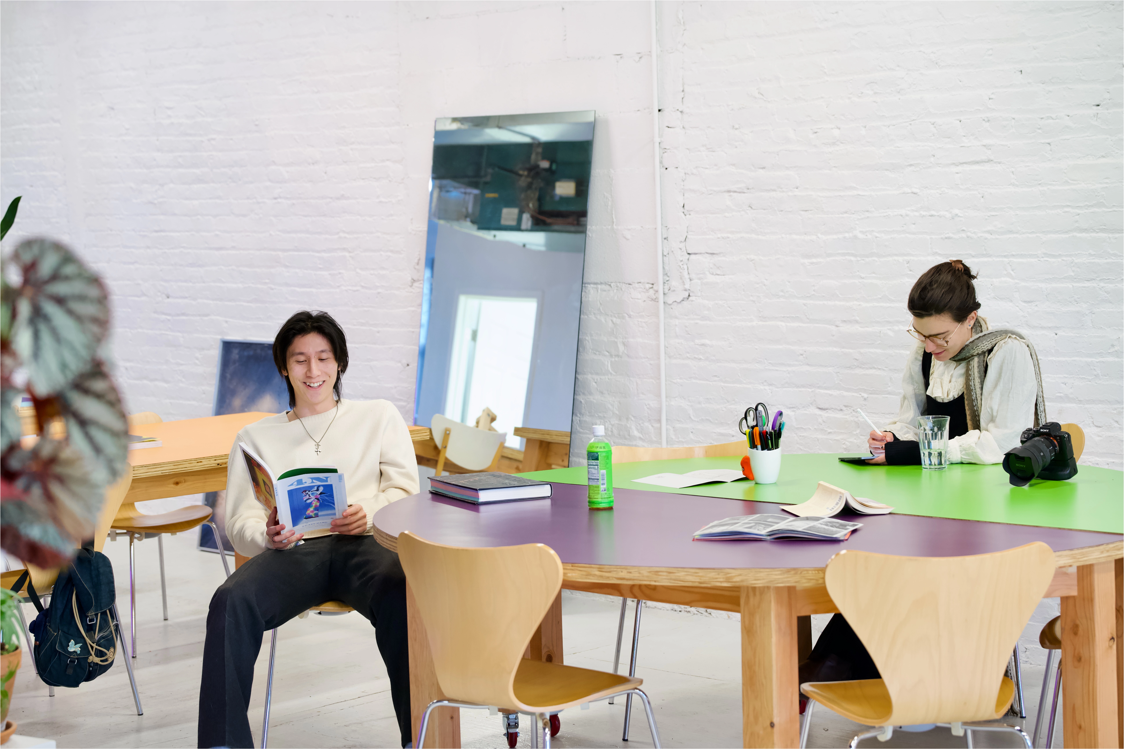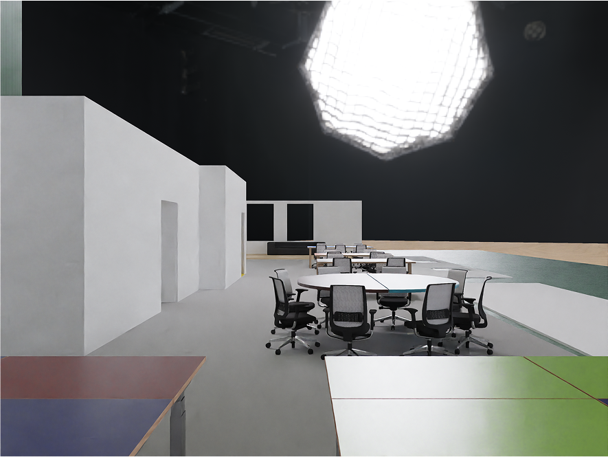 For spatial we focus on raw materials without concealment: brick, concrete, metal, plywood, plastic. Modular furniture on wheels allows for various configurations.
