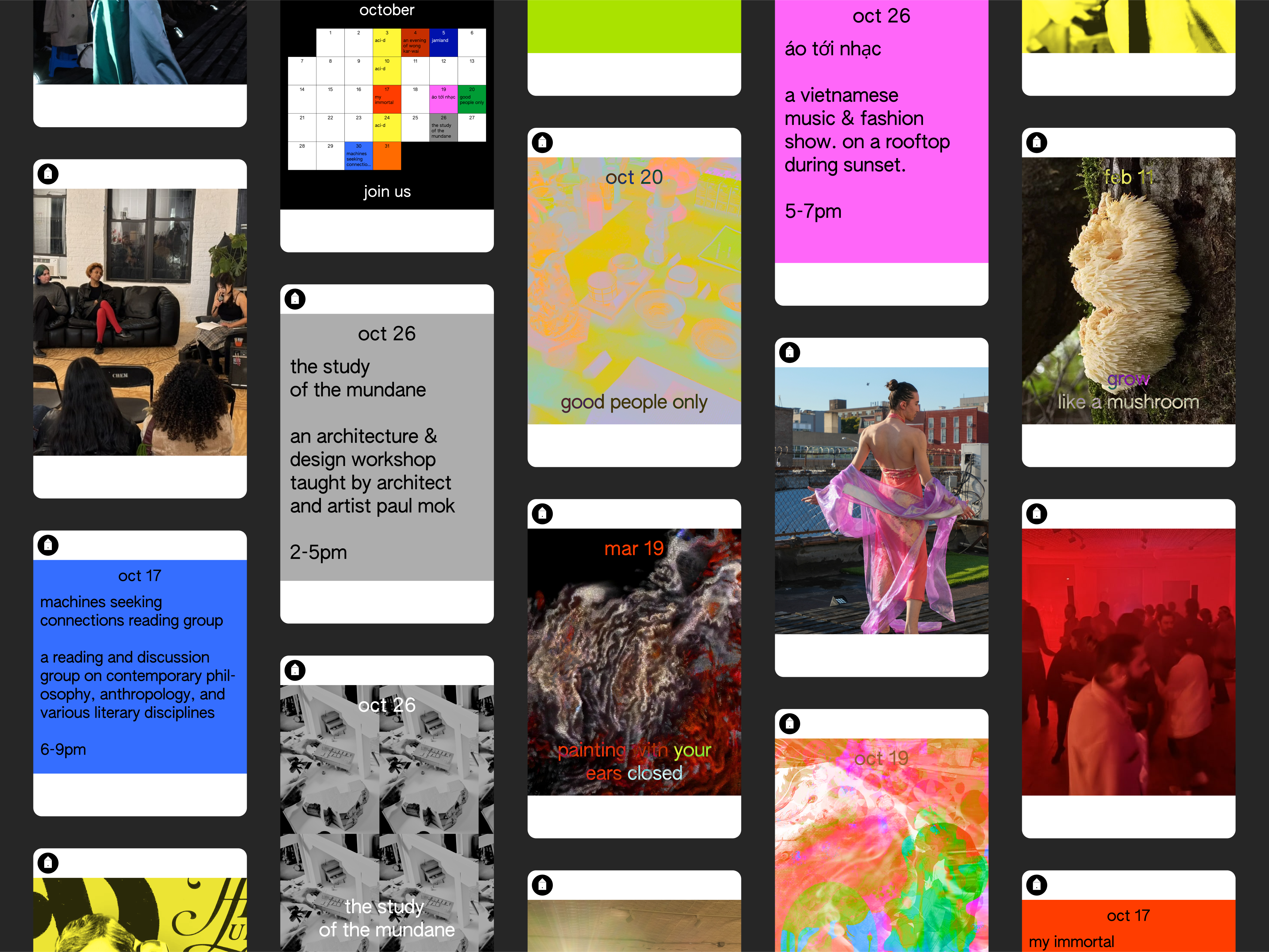 The website acts as a hub—for events, member profiles, and photo documentation. On mobile, a compact logo and adjusted type improve readability. The logo is always fixed, allowing content to flow through. Colors designate spaces and modular components both in web and spatial applicaitons.