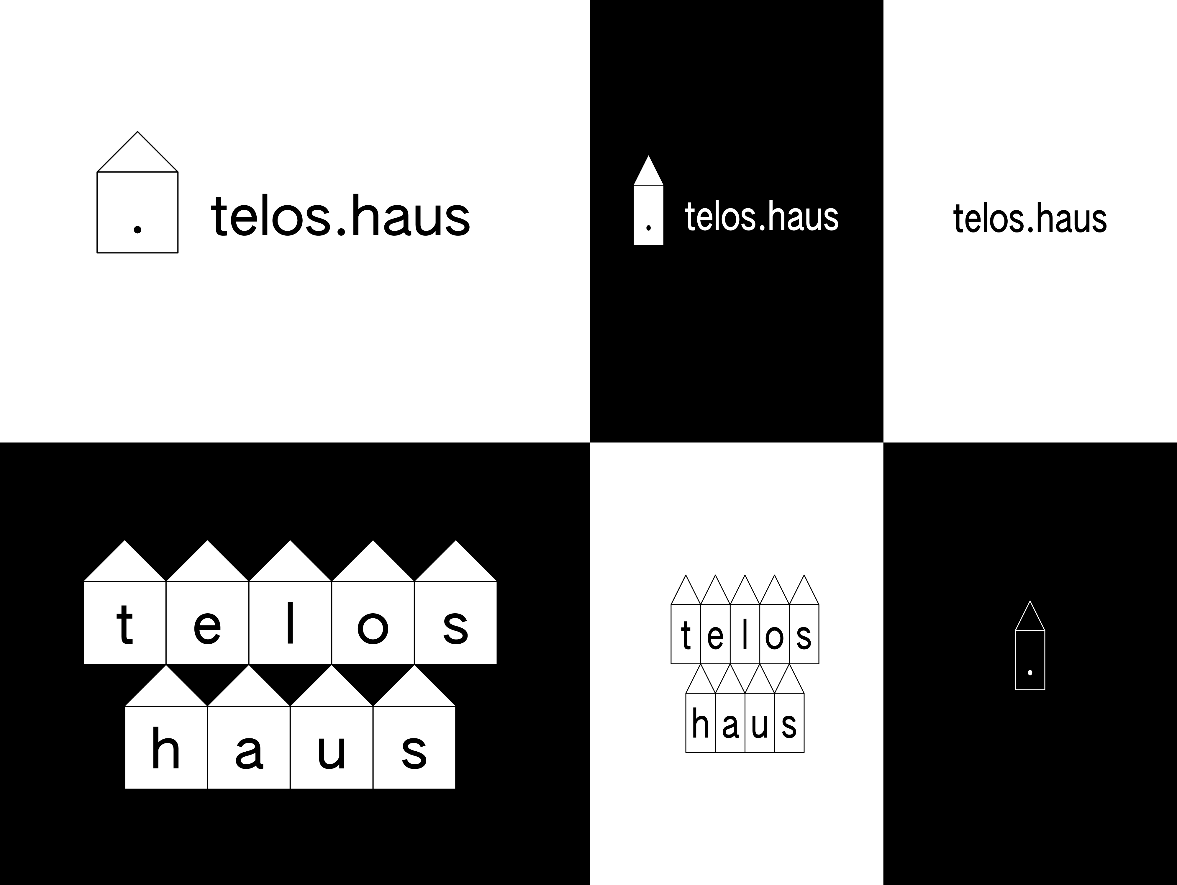 The logo is modular with three main types (stylized wordmark, logo, alternative logo), two variants (outline/full) and two states (wide/condensed). The lowercase wordmark integrates the .haus domain, with the dot functioning as a pause and focus. The house icon marks the platonic ideal of shelter, while the cluster arranges each letter within individual houses for special use cases.