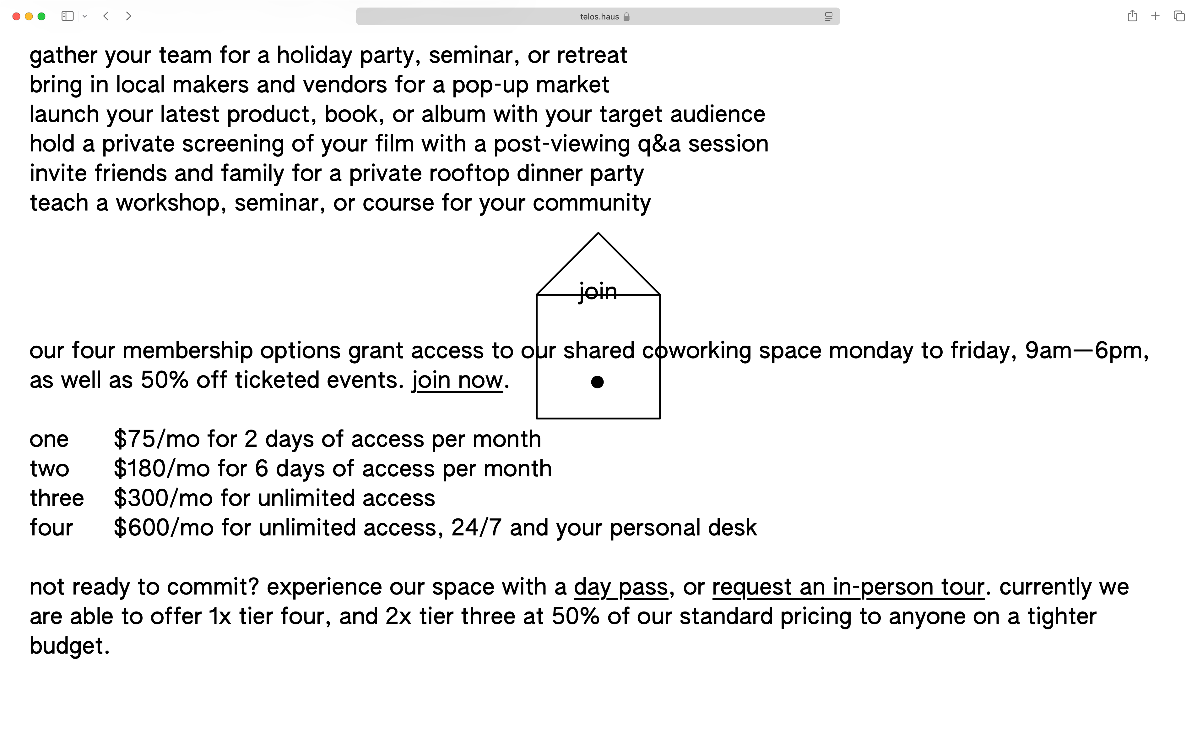 For telos.haus I am building a light-weight identity that stays out of the way, while being front and center at all times. Initially planned as a three month pop-up, it was important to use a ruleset that would fit on a napkin and could be put together by anyone with access to a text editor.