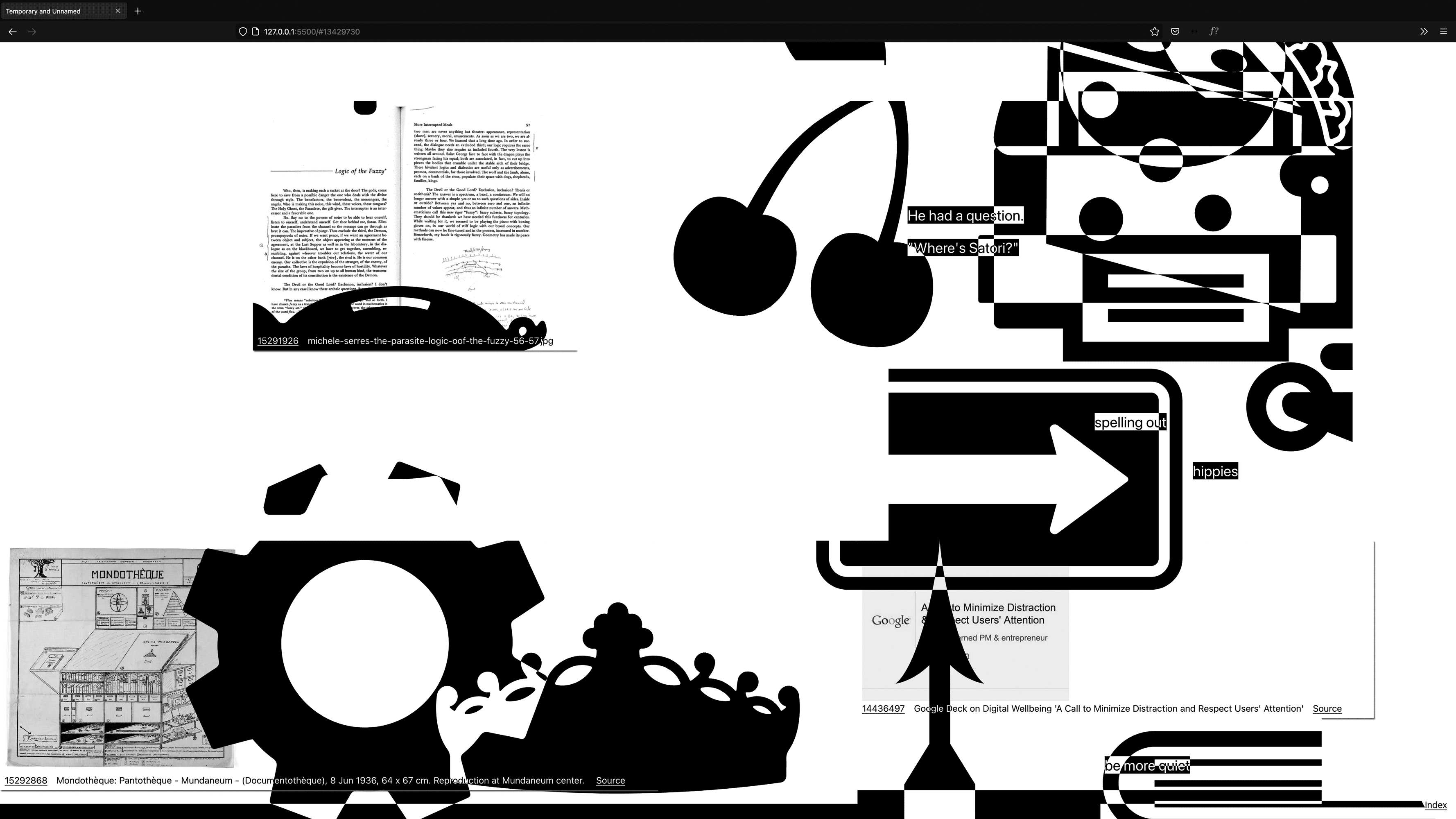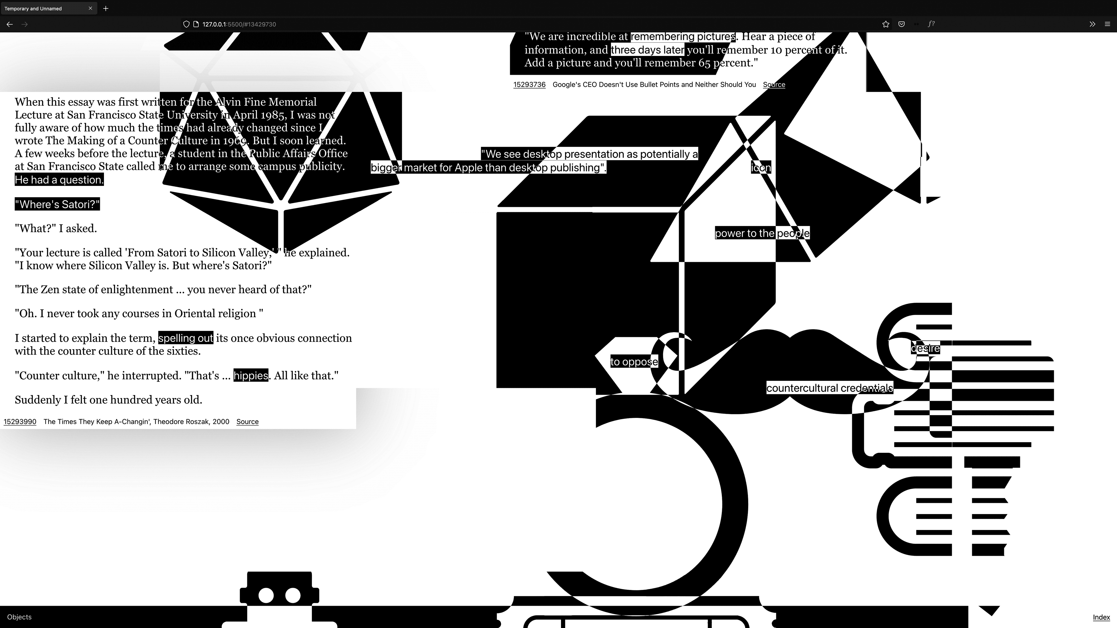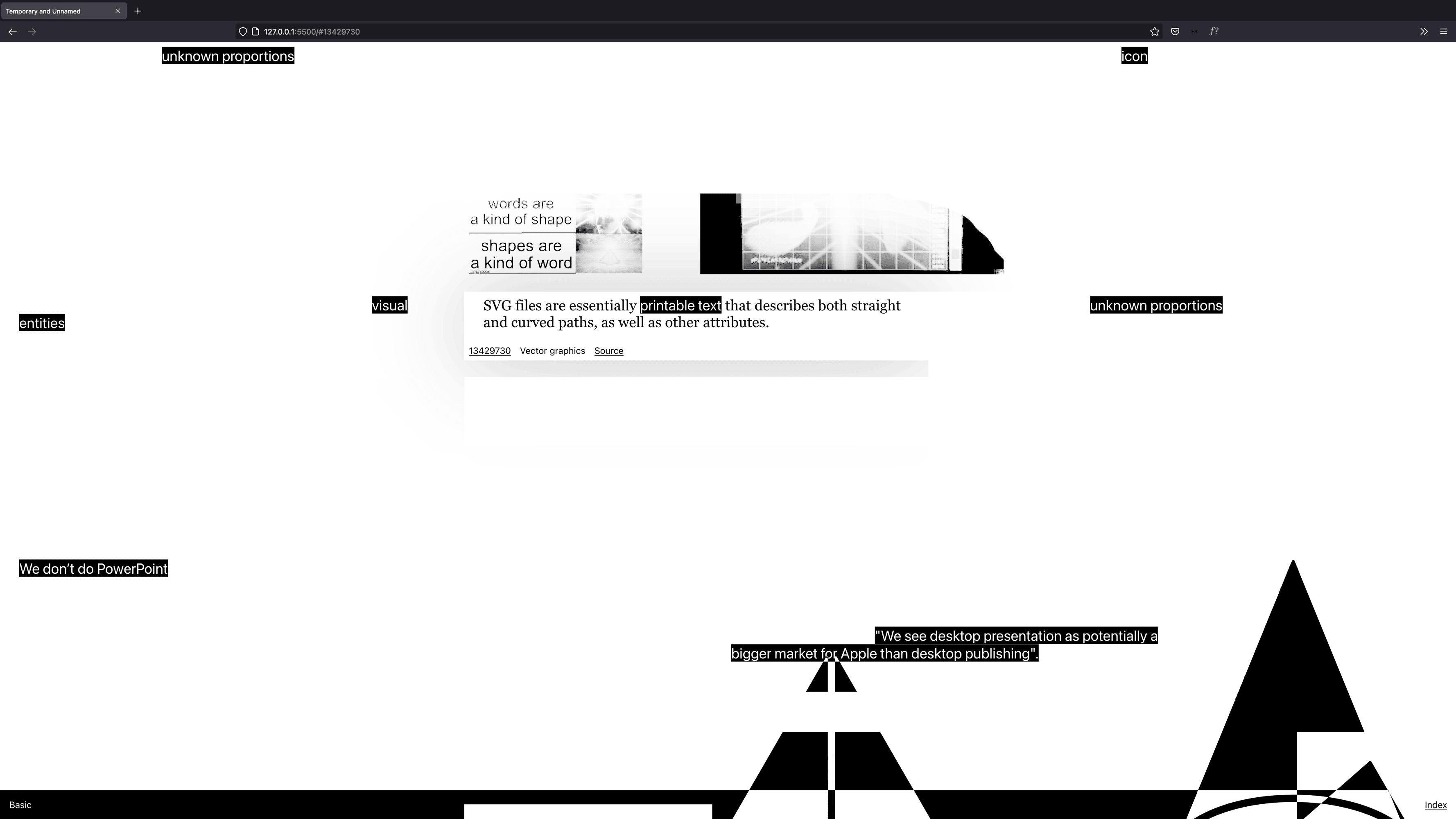 Nothing less but the entire interwingled history of (presentation) software, personal computing it's (psychedelic) corporate<>counter-culture filtered through the sixteen categories of the Apple Shape Library using the Are.na API.