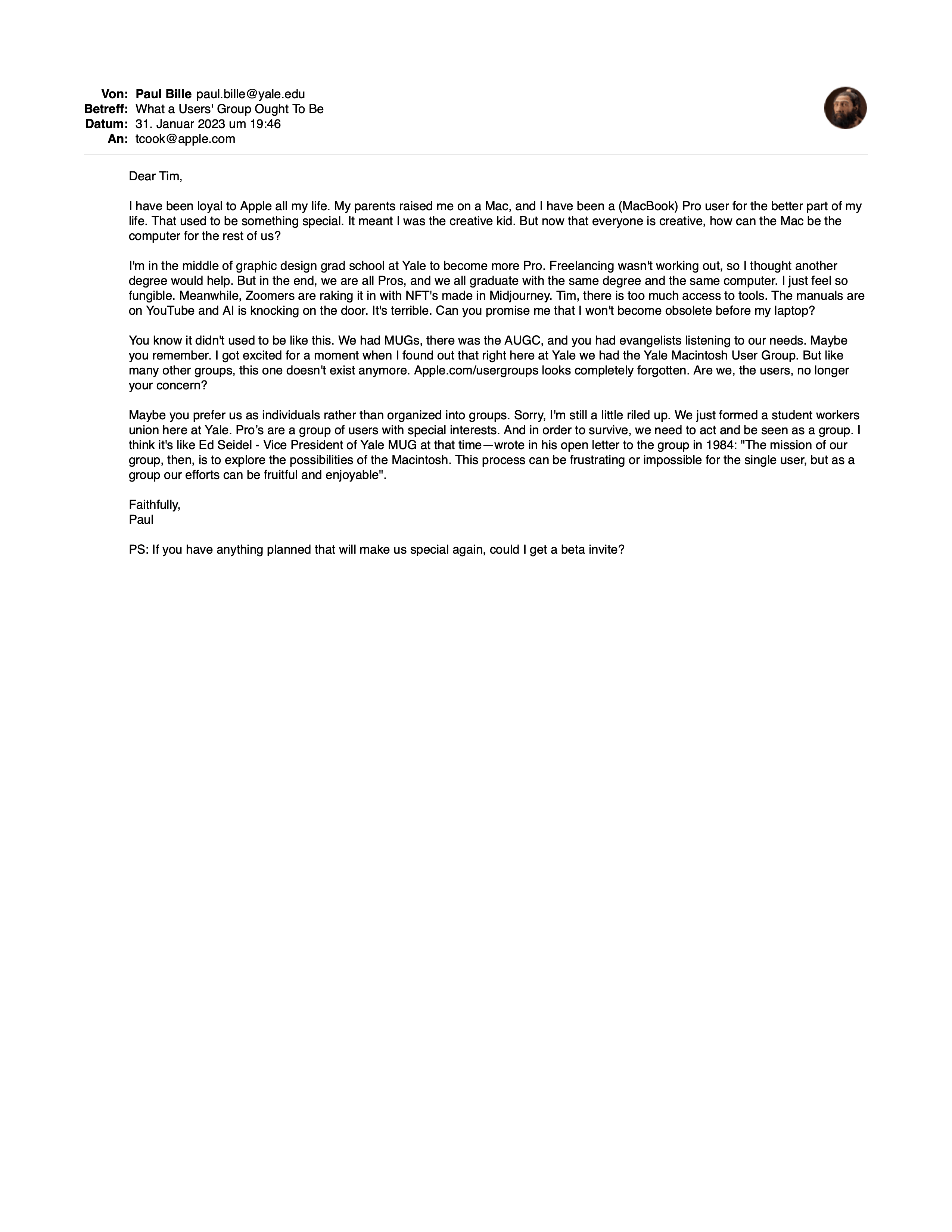 A very urgent letter sent (straight in)to Tim Cook's (spam folder).